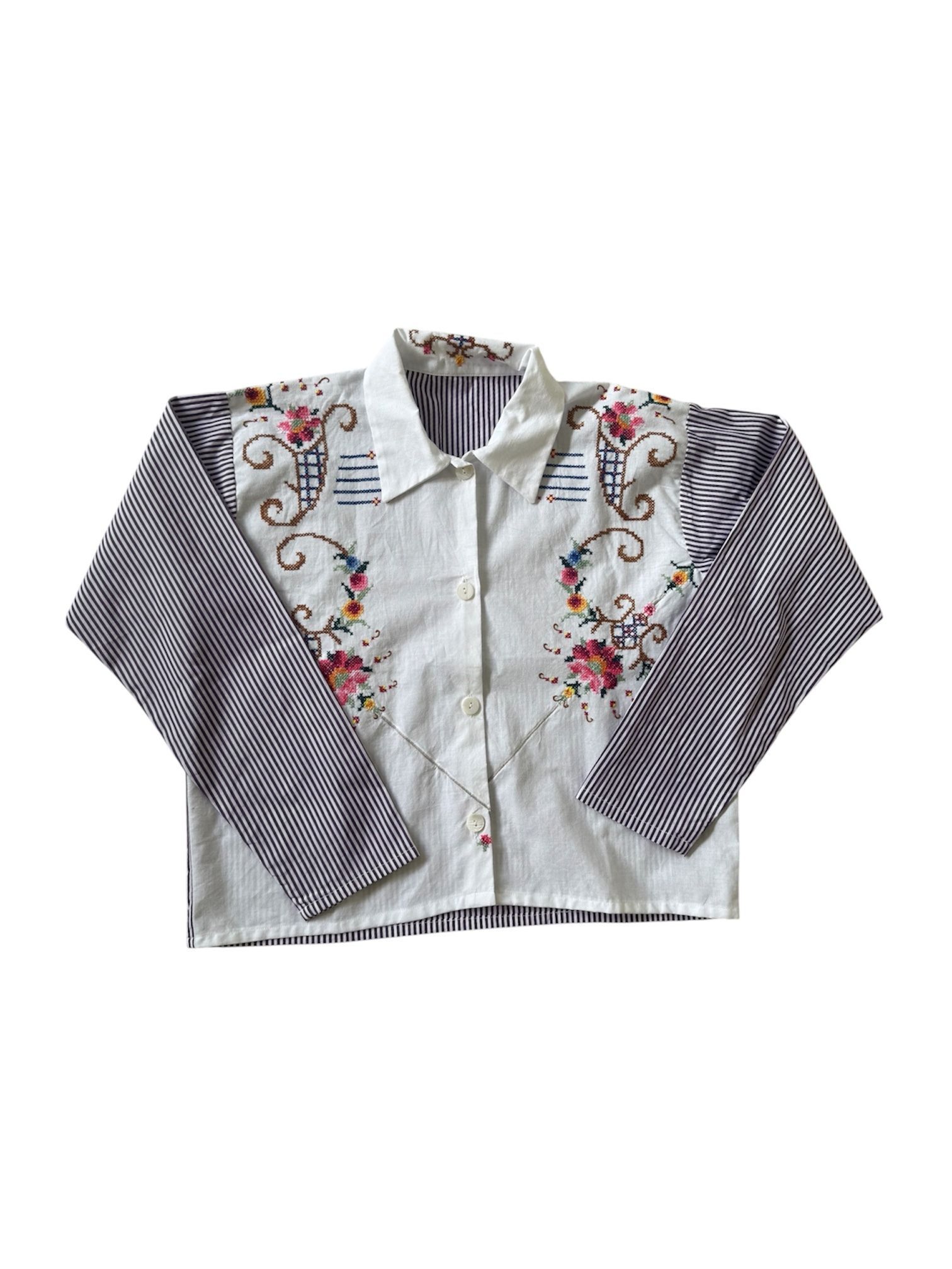 handmade shirt made from antique tablecloth and stock fabric.